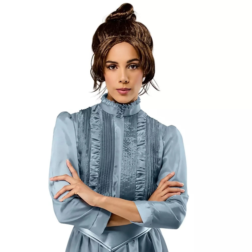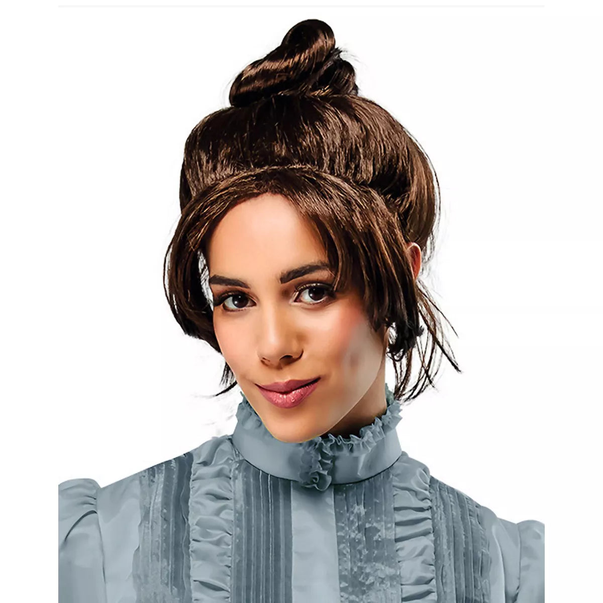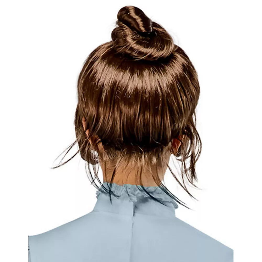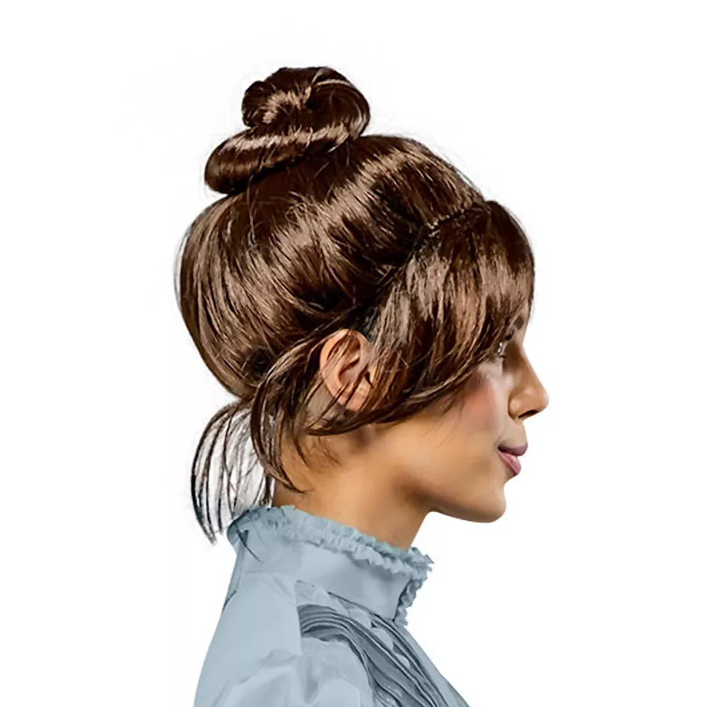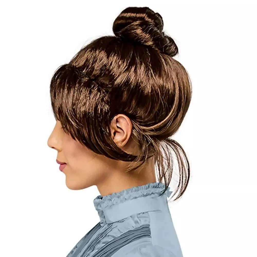 - Wig has a thick fringe parted in the centre and hair strands falling out of bun at the back