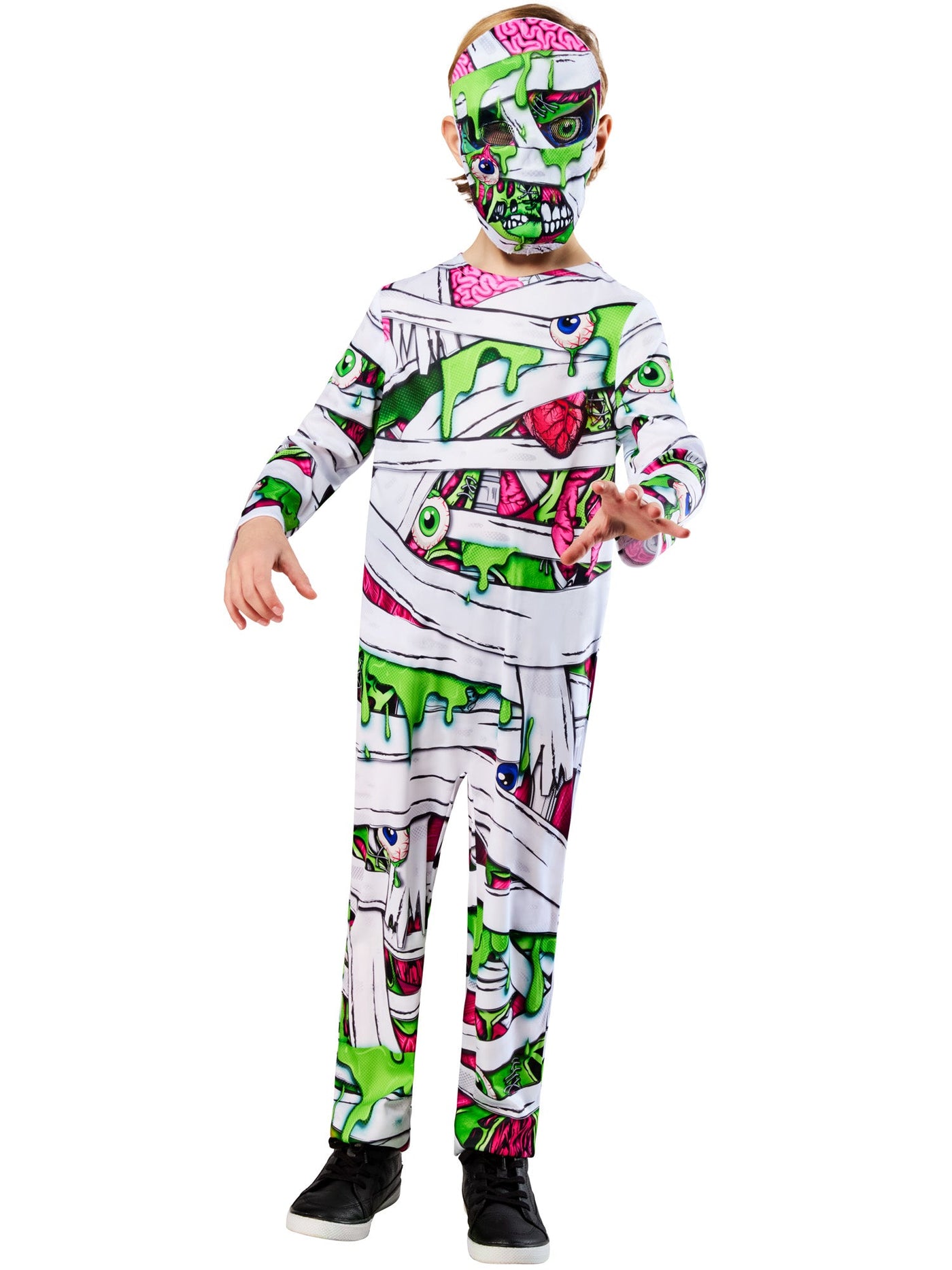 - Headpiece is a soft fabric snood with mummy bandages and gruesome mouth and eyes printed. The eye/nose holes are cut out to breathe through