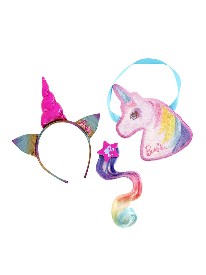 - Three-piece accessory set containing one Barbie Unicorn handbag with Unicorn horn, rainbow mane, glittery horn and strap