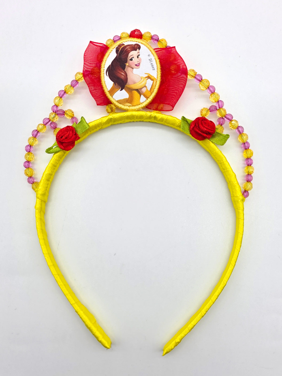 - Tiara features a fabric character pendant in the centre, plastic beading and embroidered flowers