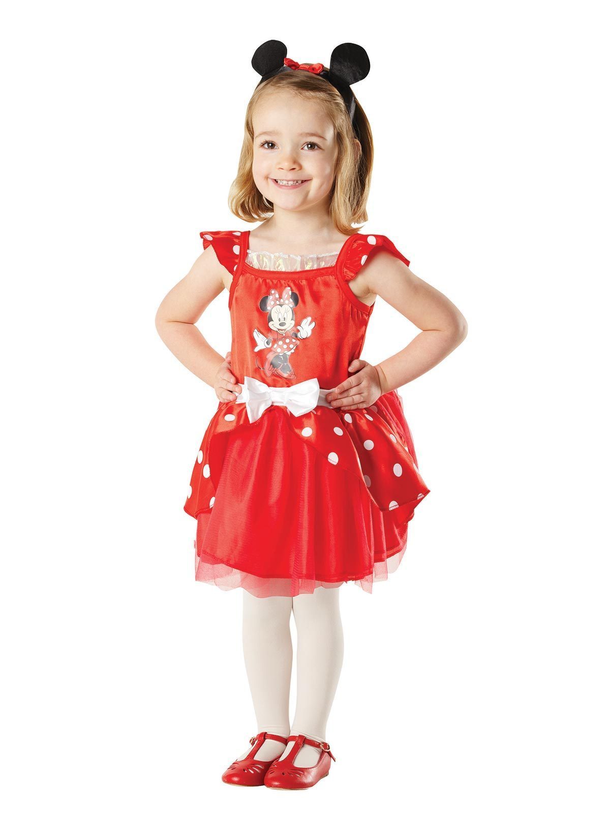 - Iconic Minnie Mouse dress with skirt featuring satin overlay pieces sewn into waistline plus tulle underneath. Bodice has attached sleevelets on shoe string shoulder straps. Centre of bodice features digitally printed Minnie Mouse print on satin material