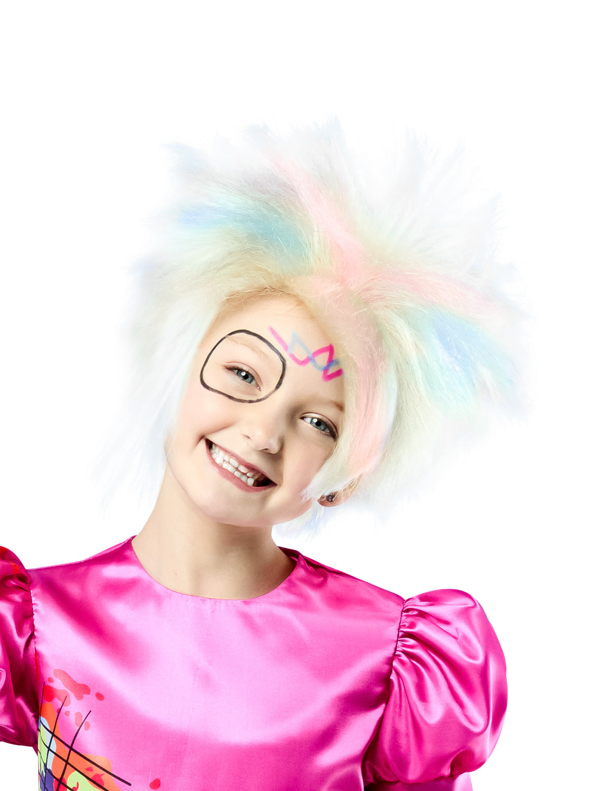 - Wig features ombre colours throughout in pinks, greens, yellows and blues
